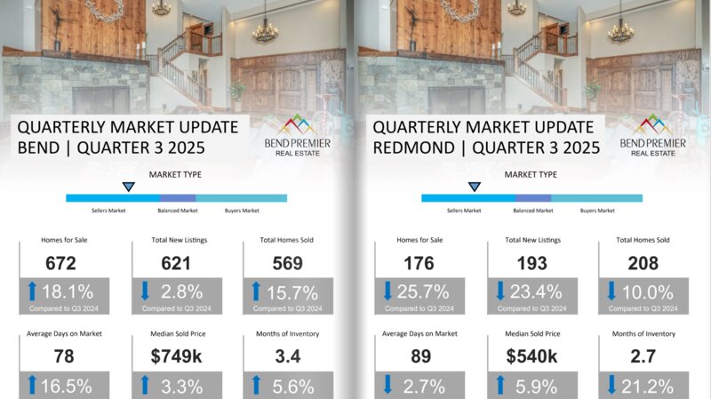 Click Here to see the Q3 Market Trends for Bend Real Estate and Redmond Real Estate, as well as the Q3 real estate trends in Sunriver, La Pine, Sisters, Prineville, Madras, Powell Butte, and Black Butte Ranch. In Q3 2025, the Bend Oregon Real Estate market and surrounding communities experienced a change when mortgage interest rates dropped in late summer. This enabled many Buyers who had been on the fence to finally make offers when their financed purchase became more affordable. Sellers who hadn't sold during the peak summer selling season were more inclined to consider below asking offers and to negotiate repairs. The number of active listings grew in all markets but Redmond, days on market increased in all markets but Redmond, and prices were up or down depending on the city. There was more balance in the market in most cities with the exception of La Pine, Madras and Powell Butte which reflect strong buyer's market. It is suggested that sellers in these cities list their homes at a price which is extremely competitive if their goal is to sell in a timely basis. A Bend Premier real estate broker understands the local Central Oregon real estate market trends, which is crucial to properly representing buyers and sellers. We can provide insights into which areas are popular, price trends, and the average time properties stay on the market. We can also provide you with access to listings that match your criteria, some of which may not be widely advertised. We also have the first word on properties about to hit the market, giving you an edge in a competitive market. 541-323-2779