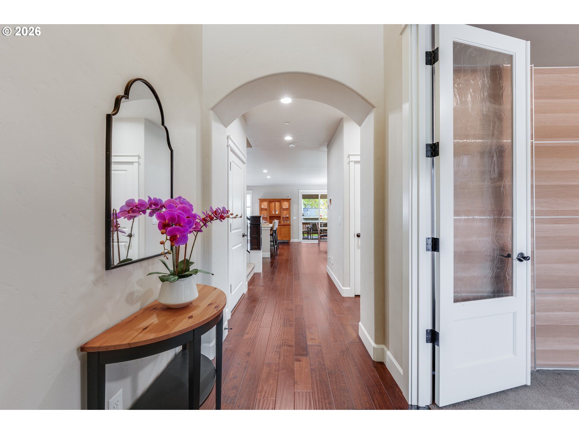 Built by Pahlisch Homes in 2014, this beautifully maintained 4-bedroom, 3-bath home in Orenco Landing offers flexible living, thoughtful upgrades, and exceptional garage space rarely found in the neighborhood. Warm wood floors welcome you into the foyer, where a main-level bedroom or office sits adjacent to a full bath with walk-in shower-ideal for guests, multi-generational living, or working from home. The open-concept great room features a cozy gas fireplace, built-in bookshelves, and a spacious kitchen with quartz countertops, built-in microwave, water filtration system, and easy flow into the dining area-perfect for everyday living and entertaining alike. Step outside to the large covered patio, flagstone pathways, and sprinkler-supported landscaping designed for easy outdoor enjoyment year-round. Upstairs offers a generous bonus room, additional bedrooms, full bath, and a spacious primary suite retreat with soaking tub, walk-in closet, glass enclosed shower, and private water closet. The upstairs laundry room adds everyday convenience, and the washer, dryer, and refrigerator are included. A standout feature of this home is the heated and insulated 4-car garage with heavy epoxy floor coating, built-in workspace in the fourth bay, and utility sink-ideal for hobbies, storage, projects, or extra vehicles. Additional highlights include central air conditioning, central vacuum, recirculating hot water system, fire suppression system, and pre-wiring for solar. Located in the highly desirable Orenco Station community near parks, shopping, dining, and transit, this home combines comfort, flexibility, and modern efficiency in one exceptional package. Open Saturday and Sunday from 1-3.