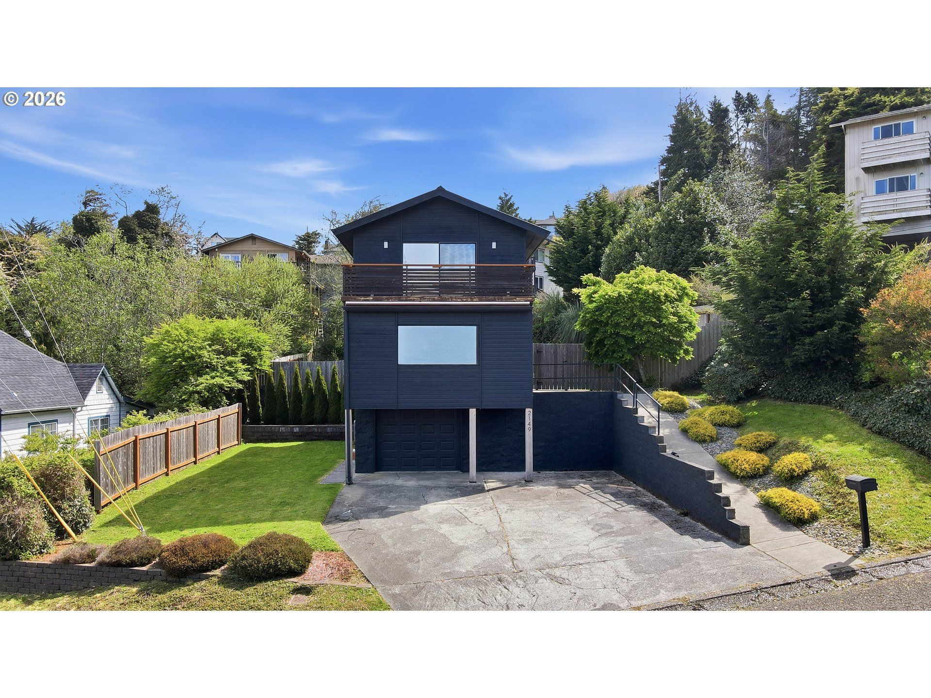 Situated on a dead-end street, this 2-bedroom, 1.5-bath home is near many local amenities. Step into the living area that features updated large windows with peeks at the bay and dunes. Both bedrooms are located upstairs, including the large primary bedroom with ample space for an office, reading area, or other uses. Deck off the primary bedroom via the large slider. A spacious main bathroom in the hallway upstairs offers double sinks, tub, and walk-in shower. Kitchen with dining area that overlooks the backyard. Conveniently located half-bath downstairs. Head out back and enjoy the fully fenced backyard with an attached cedar pergola for year-round enjoyment with installed retractable privacy blinds, and already wired with a plug for a hot-tub. The partially fenced side yard offers potential for use as even more outdoor space or transform into additional parking. Easy access to the extra-deep single car garage via the side entry off the driveway with built-ins, washer/dryer connections, room for storage, a workspace, gym space, or other bonus uses. In recent years there have been many useful updates which include a heat pump for efficient year-round comfort, hot water heater replacement, updated light fixtures, and window treatments throughout. One seller is a licensed Oregon broker. Appointment only.