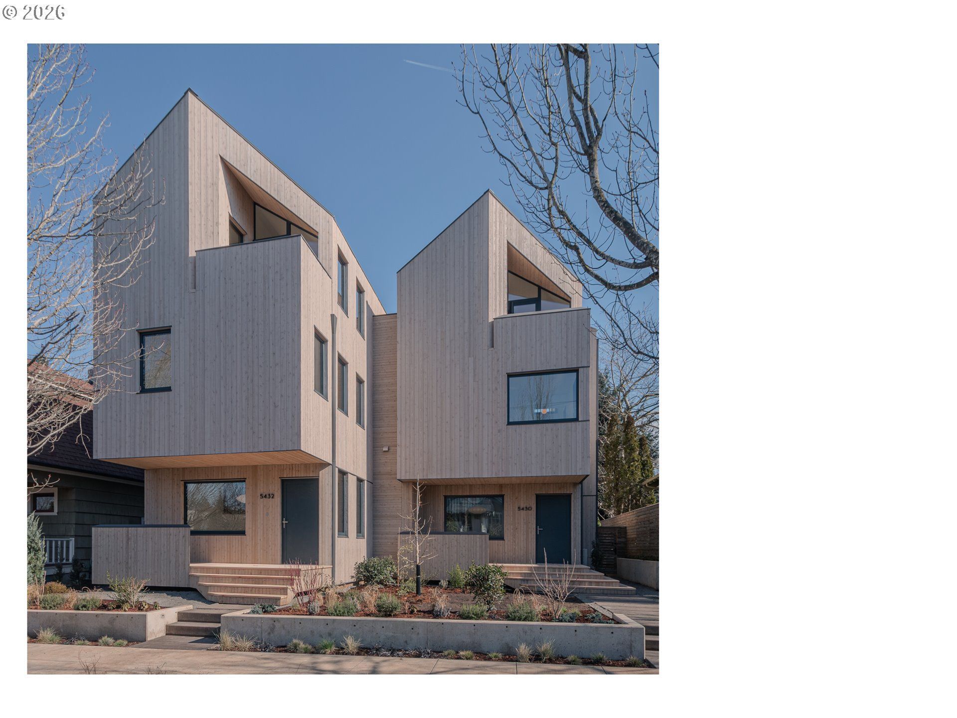 A rare opportunity to own a bespoke work of architecture nestled in the Alberta Arts district. Conceived and meticulously resolved by architect Mark Holmquist-raised in Germany and Portland, Harvard-trained, and a former associate partner at Foster + Partners (of Apple Park fame)-this modern-day Gesamtkunstwerk was recently selected for the AIA Portland Homes Tour and AIASF Design Awards. As if carved from a single block of cedar, the faceted pair of townhouses are made distinct through a series of geometric sleights of hand. Slipping one past the other, an unorthodox offset creates two reciprocal, lushly planted outdoor rooms'. A thickened party wall-expressed as a notch where the buildings lightly touch-conceals plentiful built-in storage, a critical acoustic decoupling, and allows for an unusually generous south-facing window wall. Upper decks, like the hollows of a tree, offer territorial views shrouded from the sidewalk below. The cascading steps of the front porch, paired with a dramatically cantilevered soffit above, welcome visitors in-a nod to Portland's bungalow vernacular. At the foyer, this compression gives way to the first glimpse of a gossamer stair, suspended from the roof above and threading all three levels in a continuous volume washed in light. Living, dining, and kitchen occupy the main split-level, with two bedrooms and baths on the 2nd. A vaulted, open 3rd floor offers the flexibility of ample additional living space, including a third bedroom. The palette is warm and natural, the finish details refined, and tactile. Solid white oak floors and millwork throughout balance a sleek, velvety European chef's kitchen with polished concrete underfoot. Only the two full baths-charcoal-hued retreats-depart from the airy theme. Guided by passive house principles, the homes are exceptionally energy efficient-and thanks to integrated rooftop solar, nearly net-zero. Built for comfort, longevity, and inspiration-designed as if for the architect themselves. [Home Energy Score = 10. HES Report at https://rpt.greenbuildingregistry.com/hes/OR10246489]